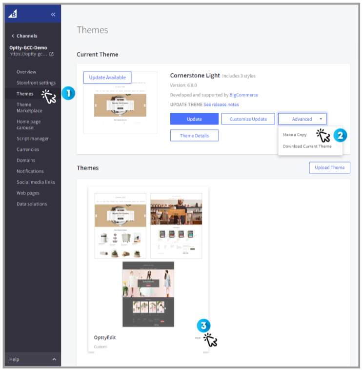 Make a copy of your theme by clicking Edit storefront settings and then selecting Themes from the left menu, then under the [Advanced] button, click Make a Copy from the drop down menu. Once you name the new theme click Save a Copy.