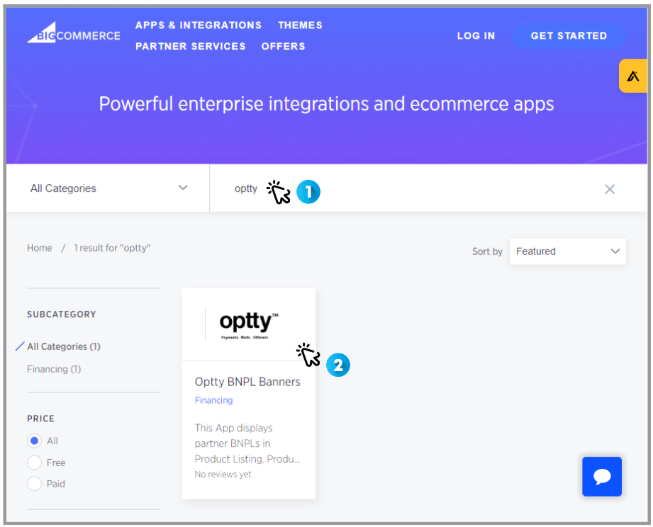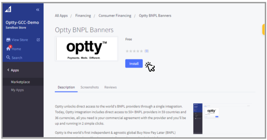 Once in the marketplace, simply search for **Optty** via the search bar at the top of the page, and an App called **Optty BNPL Banners** should appear.&#x20;