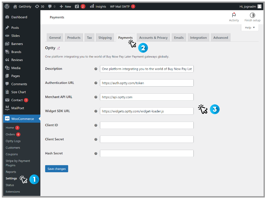 Next, you'll need to configure the Optty plugin. You can get to the settings page by clicking [Settings] under WooCommerce in the left hand menu, and then selecting the [Payments] tab at the top of the page.