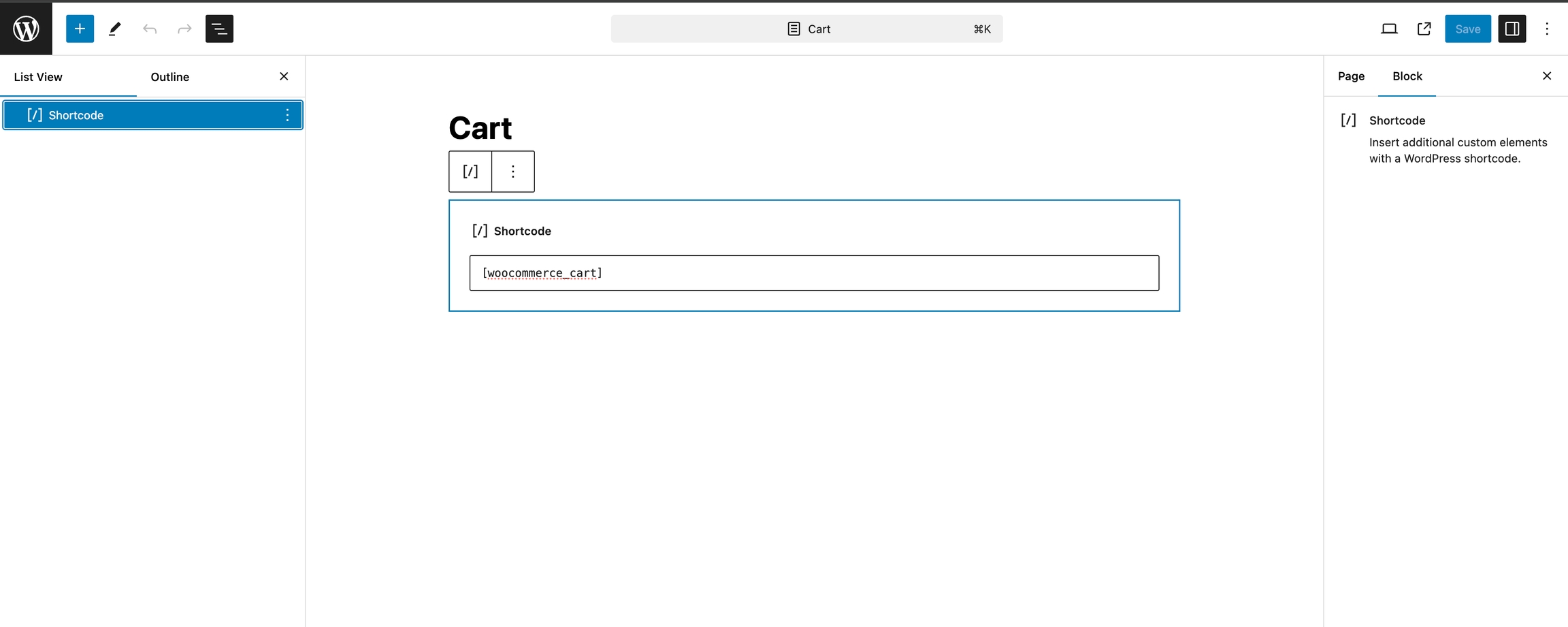 In this step, we will link the Optty checkout and cart to your site. Go to Pages on the side navigation bar. For the Cart Page and Checkout Page, go through the two following steps, remove all content on the page add a shortcode block and enter the following, for the checkout page enter "[woocommerce_checkout]" and for the cart page enter "[woocommerce_cart]".