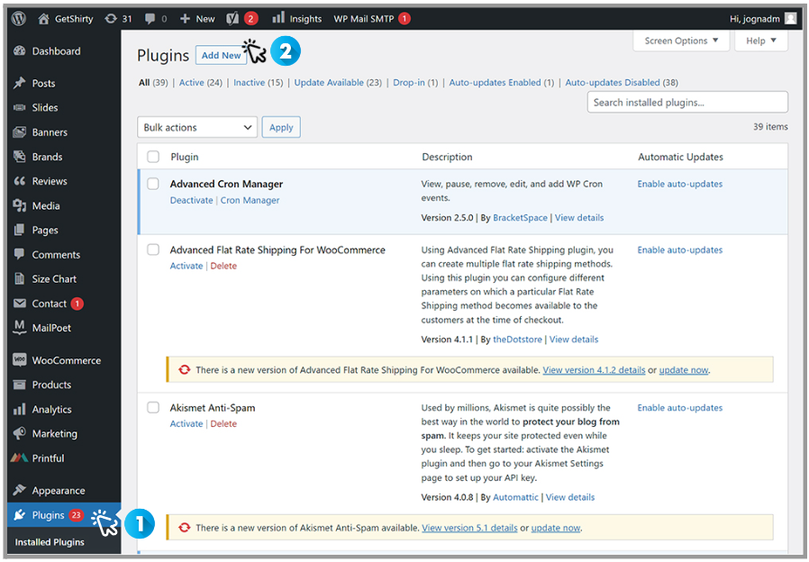 Once you’ve logged into the admin portal of your store, click Plugins on the left hand menu and then Add New at the top of the page.