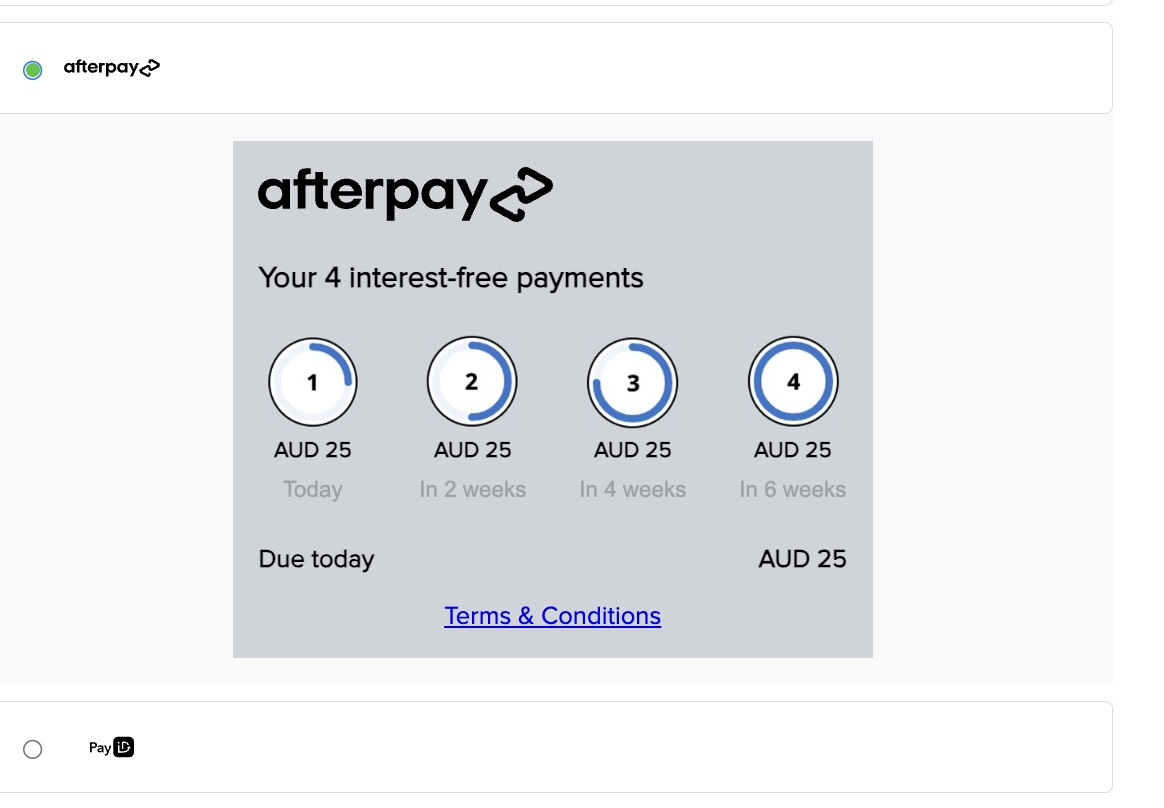 <div class="optty-easy-checkout-widget"></div>When a payment method is selected, there is a drop down with call to action information about the provider, in the example you can see the AfterPay default content. Explain how the buy now pay later works to the customer before they proceed to checkout.
